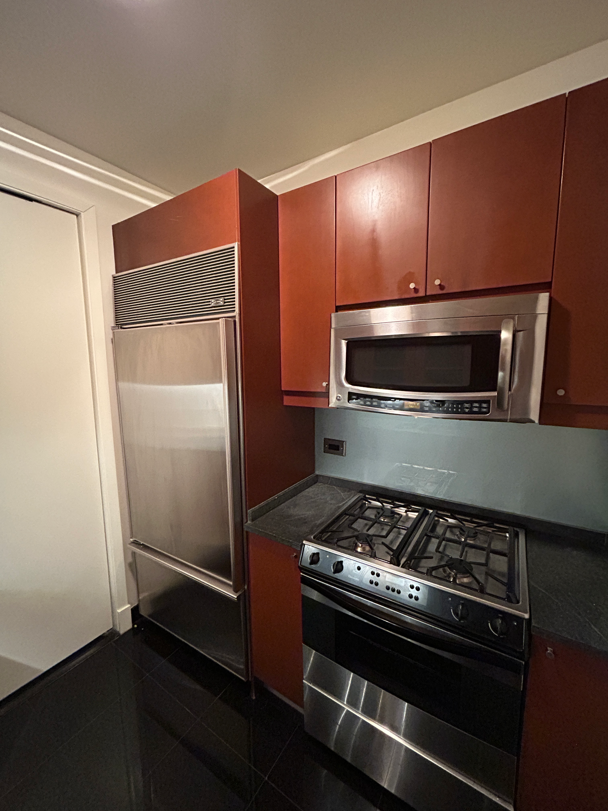 Located in “Hells Kitchen”, NYC, this kitchen was outdated and required new cabinets and lighting. Upgraded cabinet layout, stained white oak fronts and recessed integrated led’s. Push-to-open & soft close hardware.