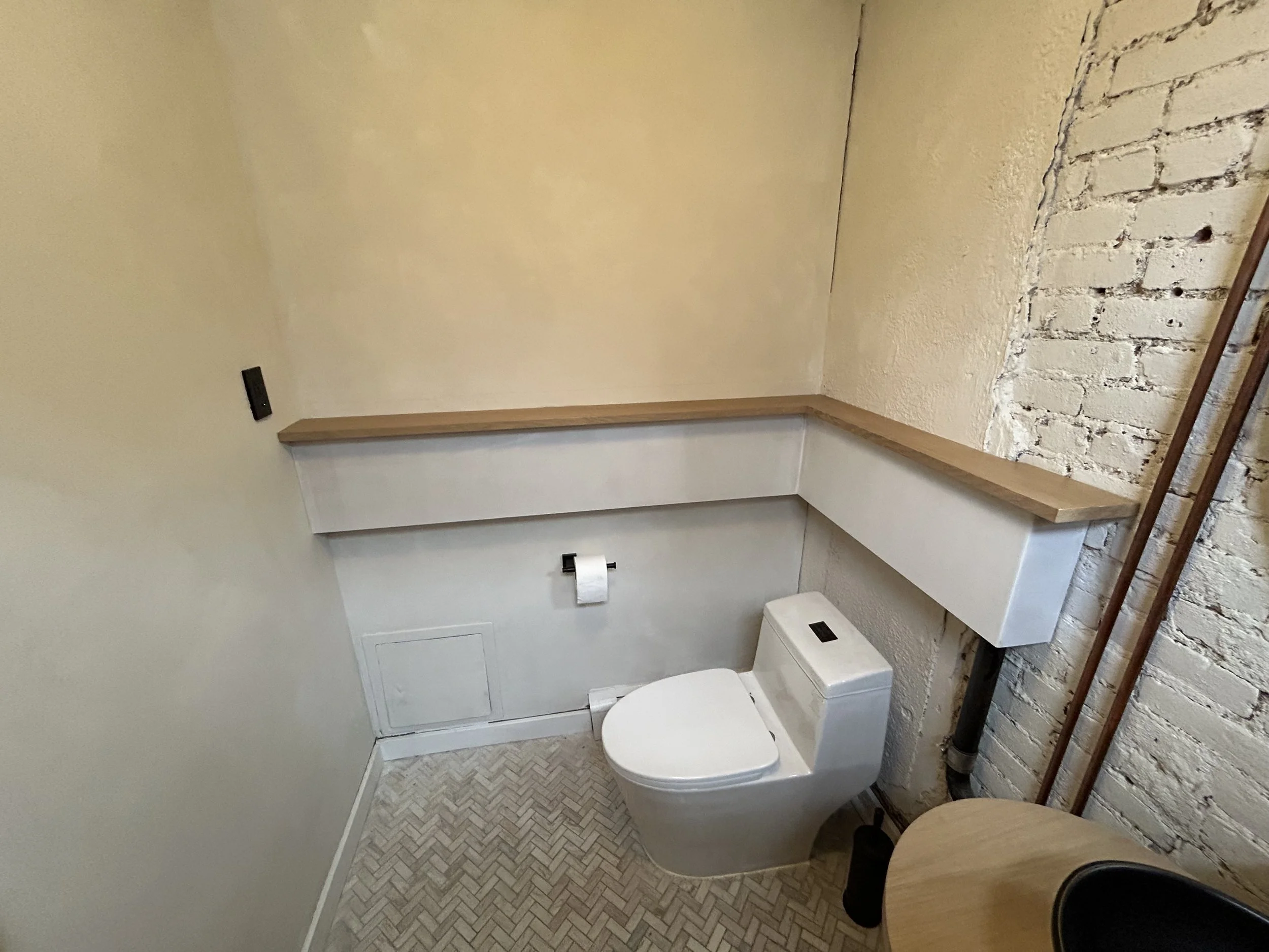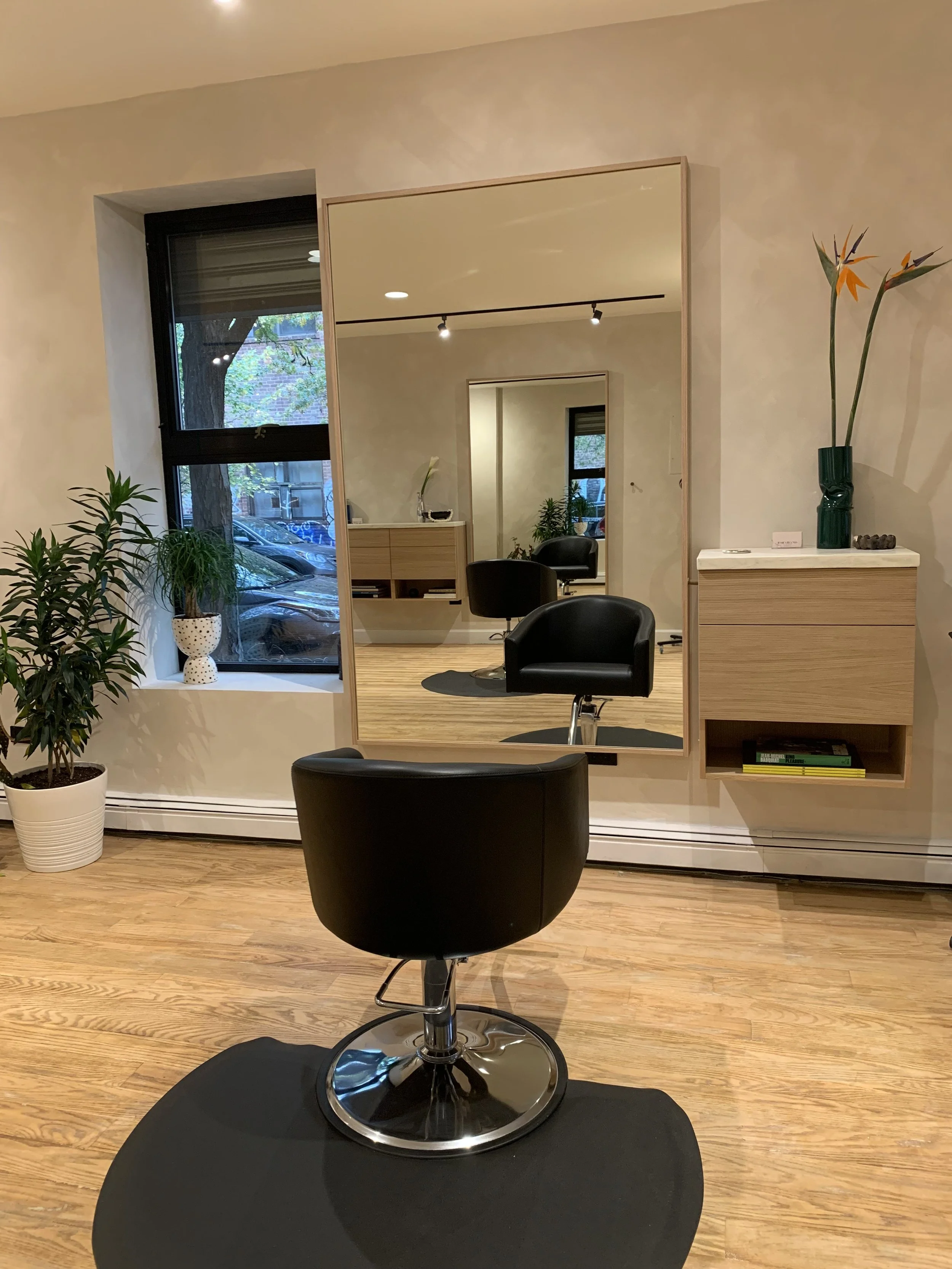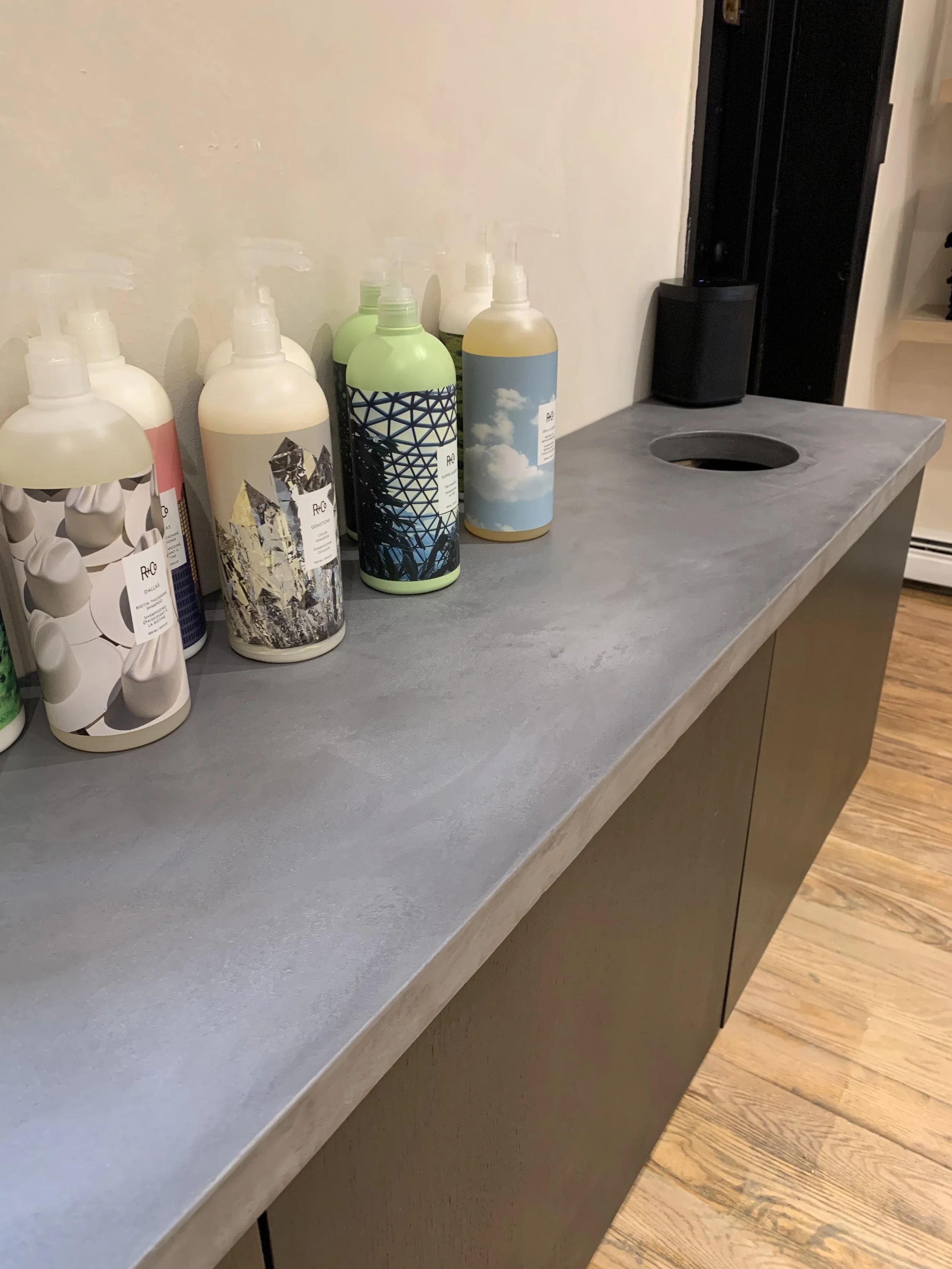 stylist stations, washing station, vanity & mirror frames designed for second day salon located in greenpoint, brooklyn. with concrete tops provided by oso industries, the white oak stations and black stained white oak washing station provide a clean, functional space for each stylist. a curved vanity & ledge was created to bring the bathroom together. push-to-open & soft close drawers for easy access while working.